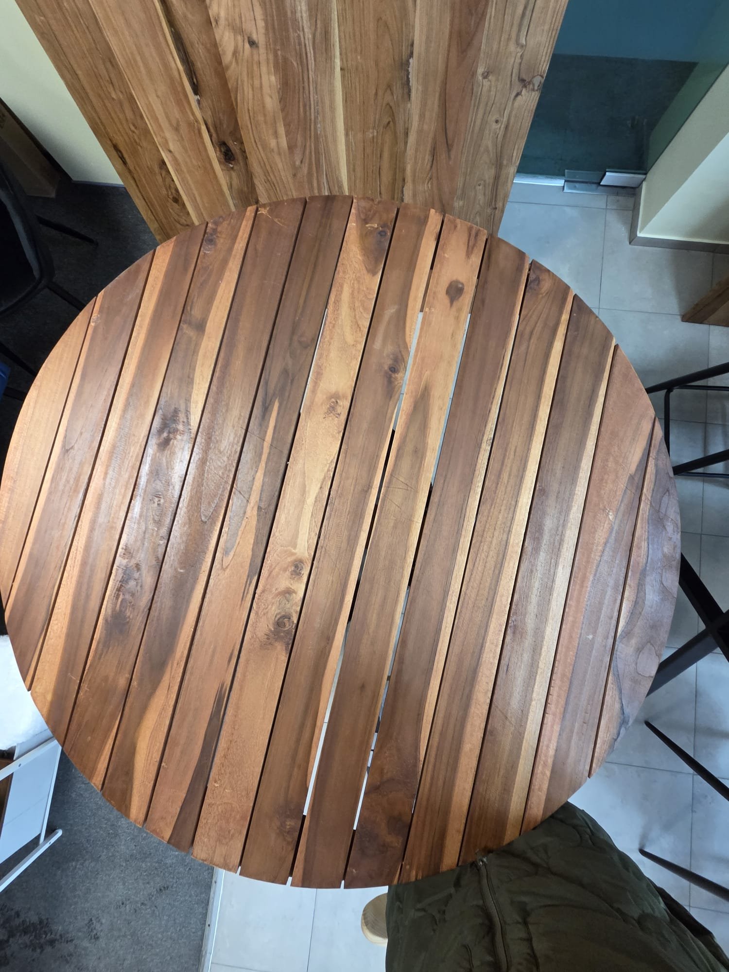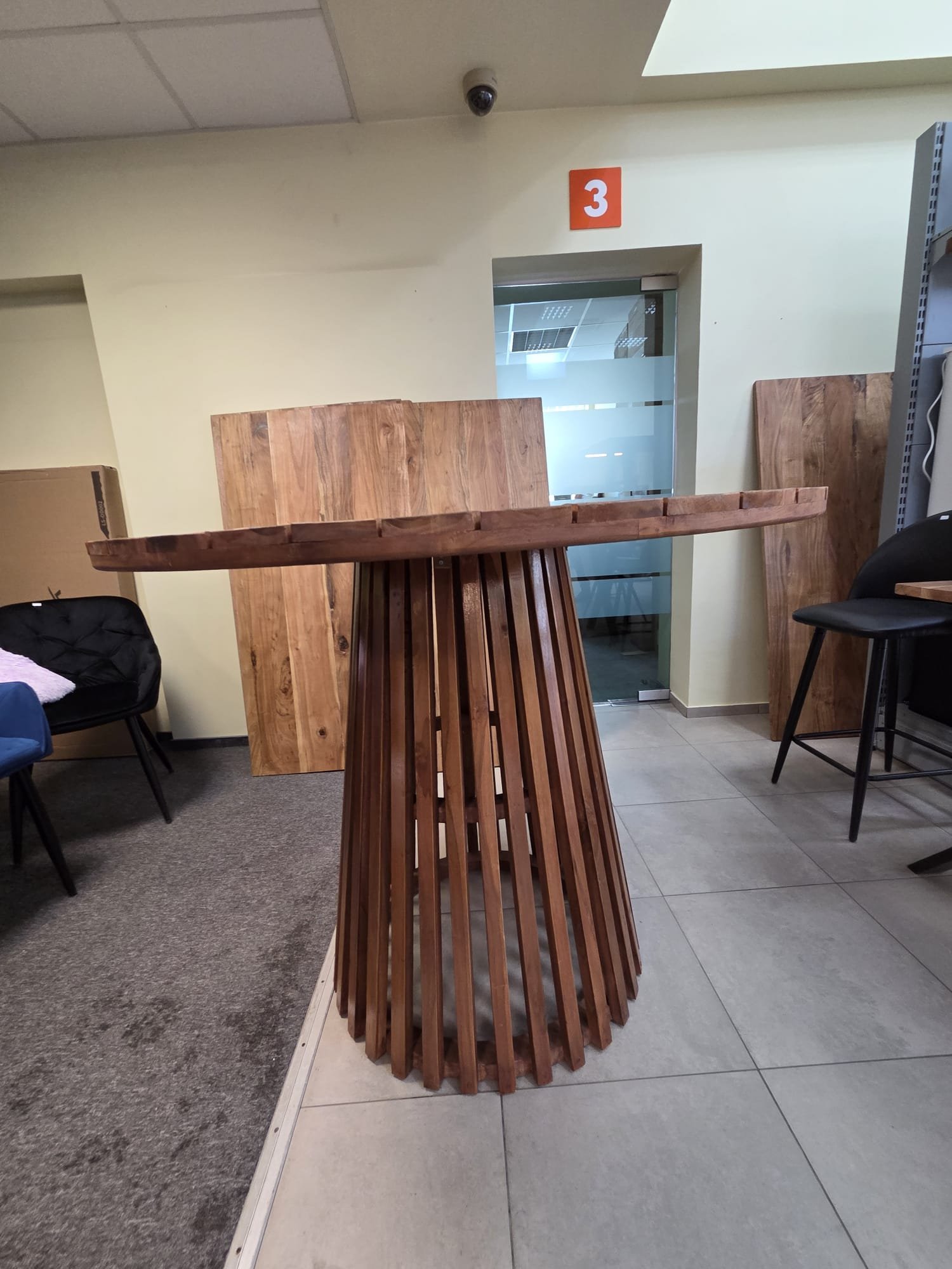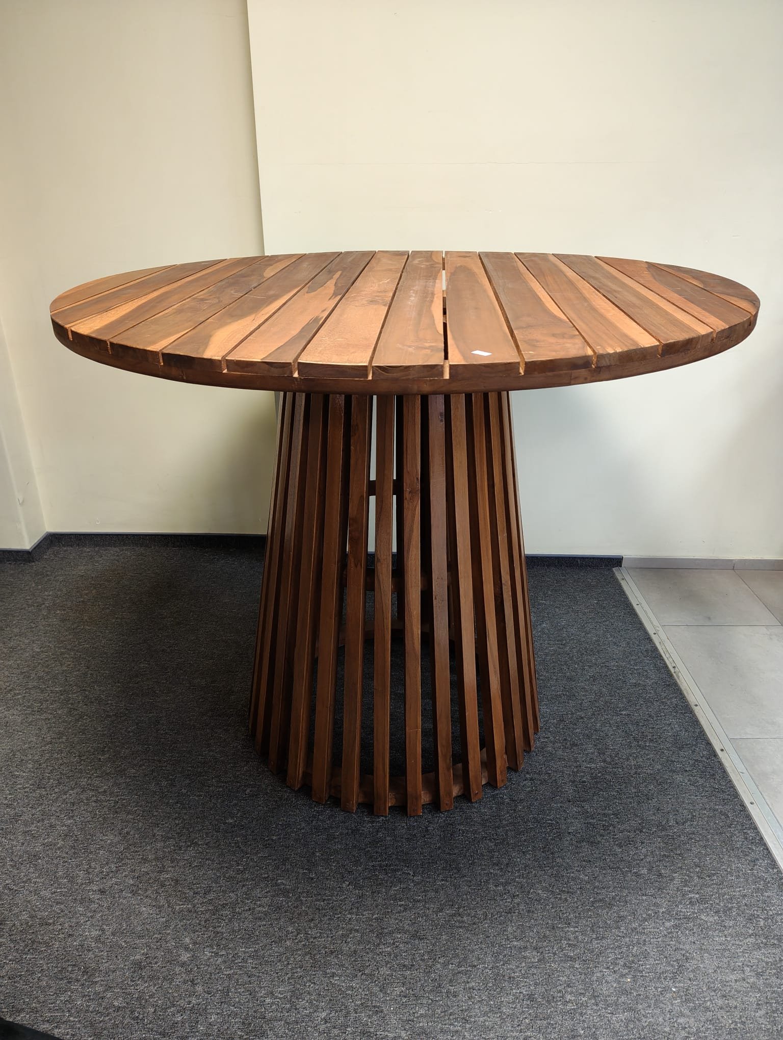 Apvalus medinis stalas su unikaliu grotelių arba „žaliuzių” stiliaus pjedestalo pagrindu. Šie stalai gaminami iš tvirtos medienos ir yra populiarūs kaip valgomojo ar lauko baldai dėl savo išskirtinio dizaino ir patvarumo.