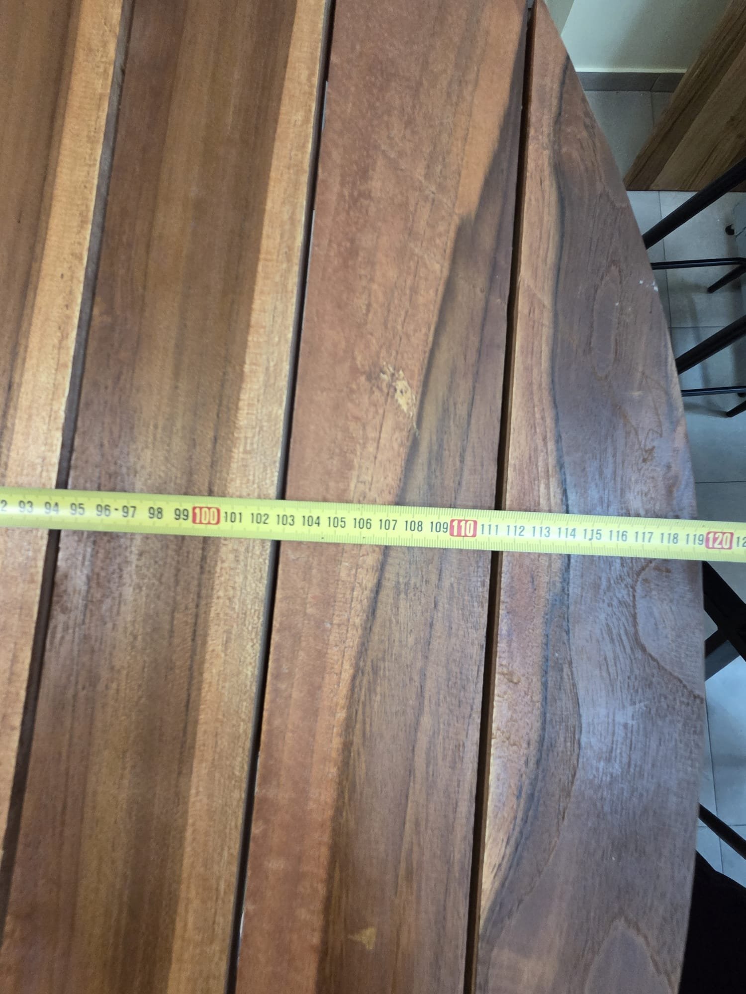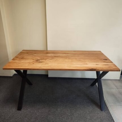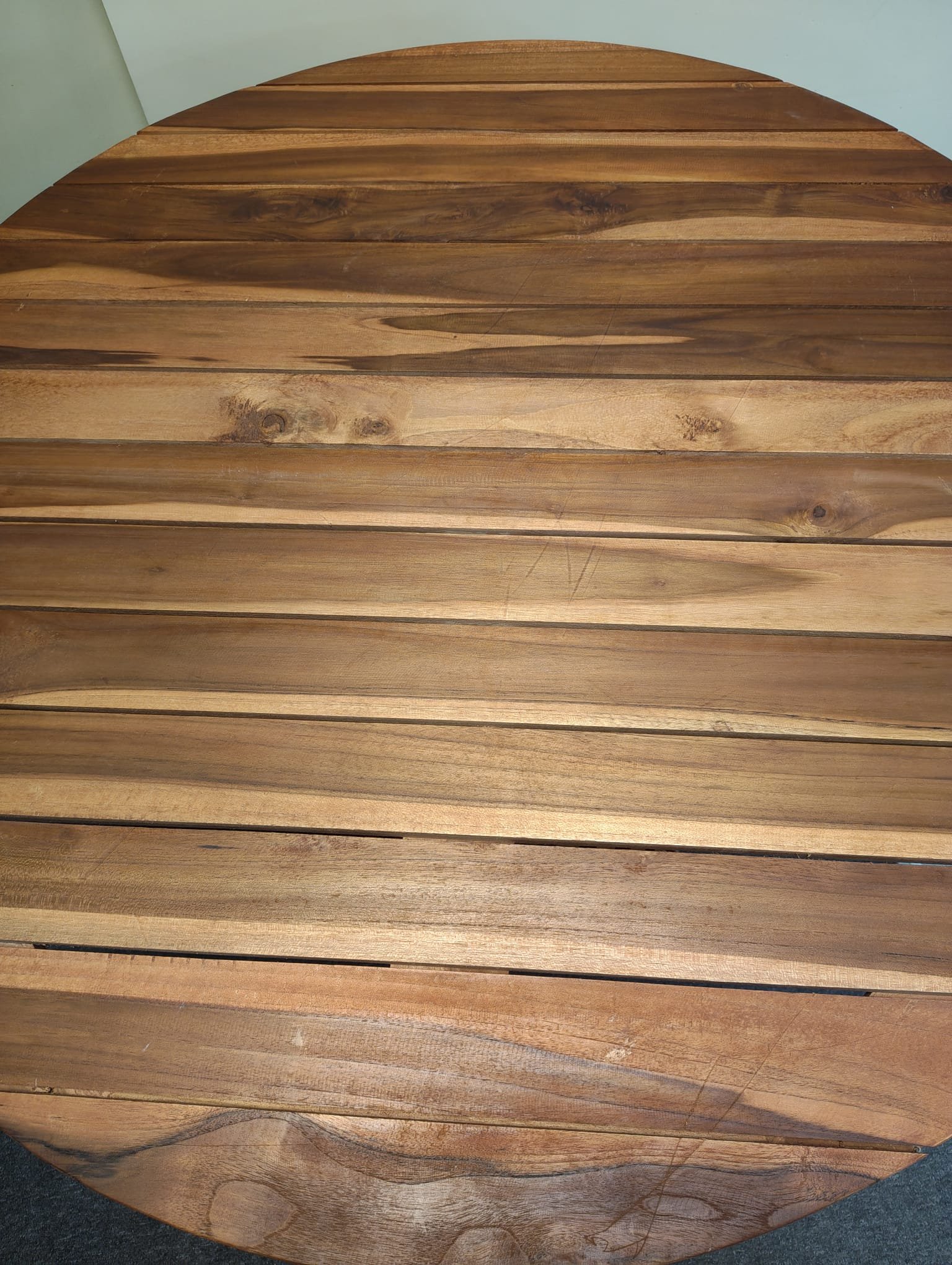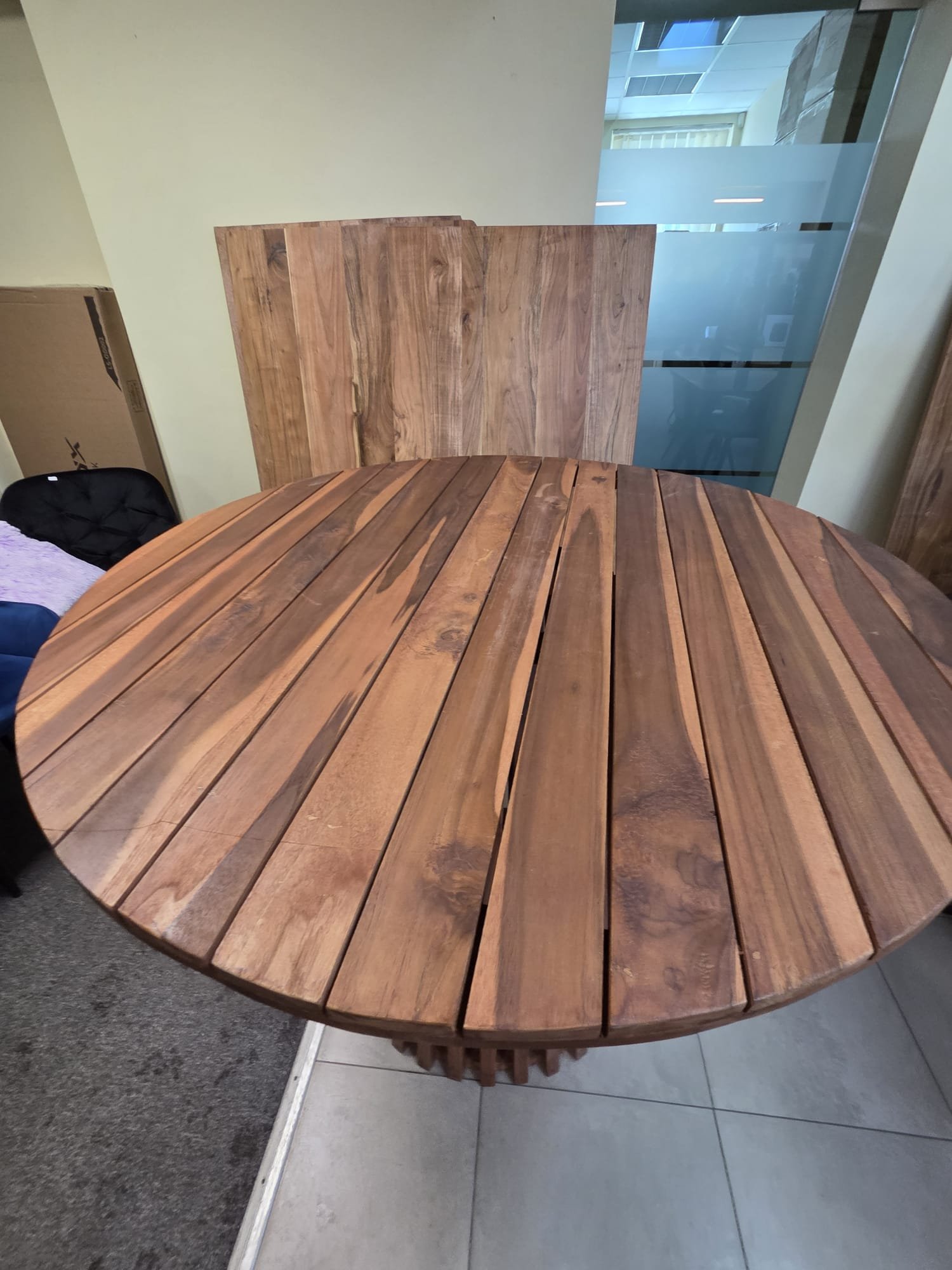 Apvalus medinis stalas su unikaliu grotelių arba „žaliuzių” stiliaus pjedestalo pagrindu. Šie stalai gaminami iš tvirtos medienos ir yra populiarūs kaip valgomojo ar lauko baldai dėl savo išskirtinio dizaino ir patvarumo.