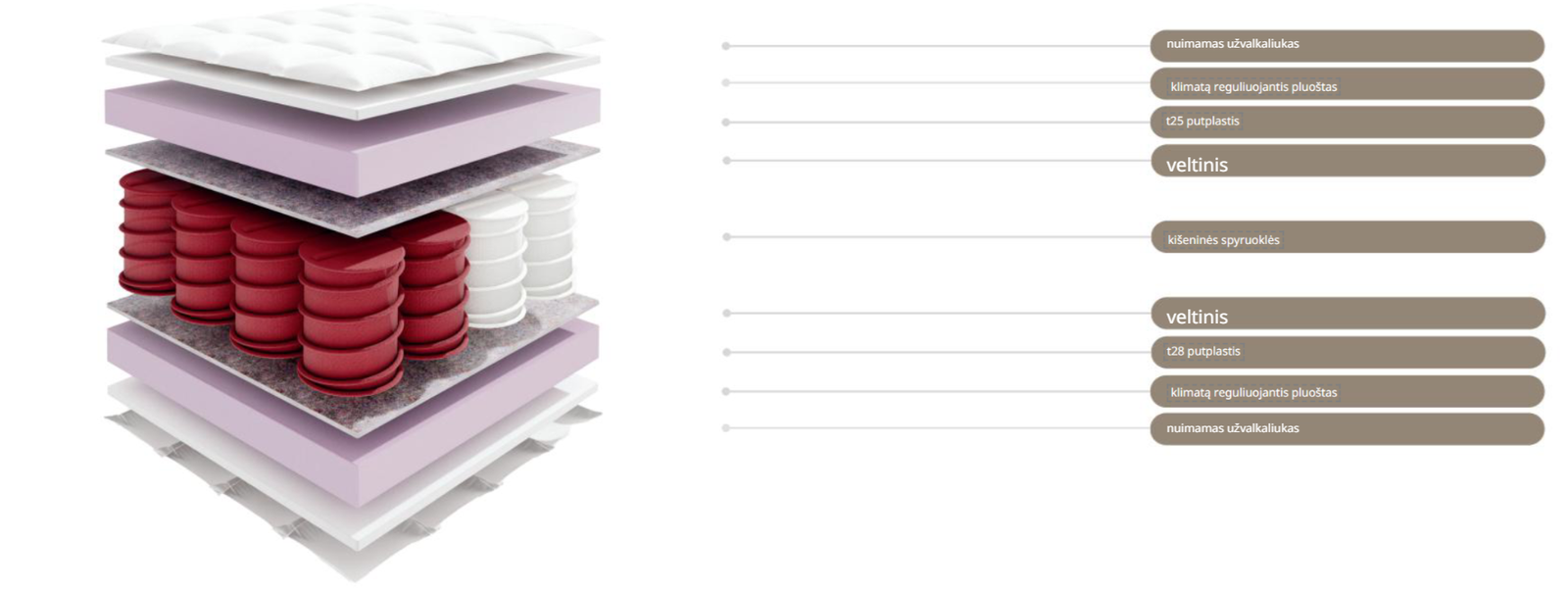 Medžiaga: Kišeninės spyruoklės, T25 putplastis, veltinys, nuimamas, skalbiamas užvalkalas.
