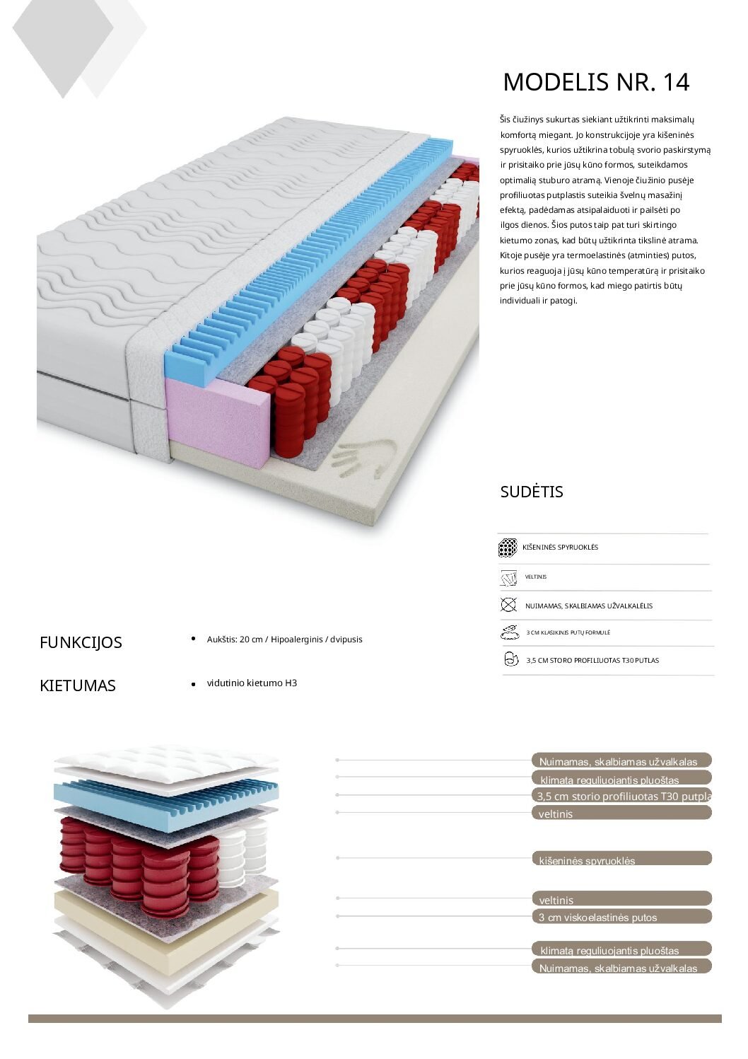 Medžiaga: Kišeninės spyruoklės, 3 cm viskoelastinis putplastis, 3,5 cm kontūrinis putplastis,Veltinys, nuimamas, skalbiamas užvalkalas