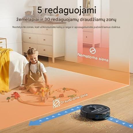 Išmanioji programėlė ir balso valdymas: Naudodami intuityvią B20 roboto dulkių siurblio programėlę, galite lengvai suplanuoti valymo sesijas pagal savo pageidavimus. Tinkinkite valymo grafiką nustatydami konkretų laiką ir zonas tiesiai iš programėlės, užtikrindami nepriekaištingai švarias grindis grįžus namo. Programėlė leidžia jums pažymėti iki 20 draudžiamų zonų ir 10 virtualių sienų, todėl „B20“ gali vengti šių zonų valymo metu. Be to, suderinamumas su „Alexa“ ir „Google Assistant“ leidžia patogiai balsu duoti „B20“ komandą pradėti arba sustabdyti valymą (*Įsitikinkite, kad jūsų „Wi-Fi“ tinklas veikia 2,4 GHz dažniu).