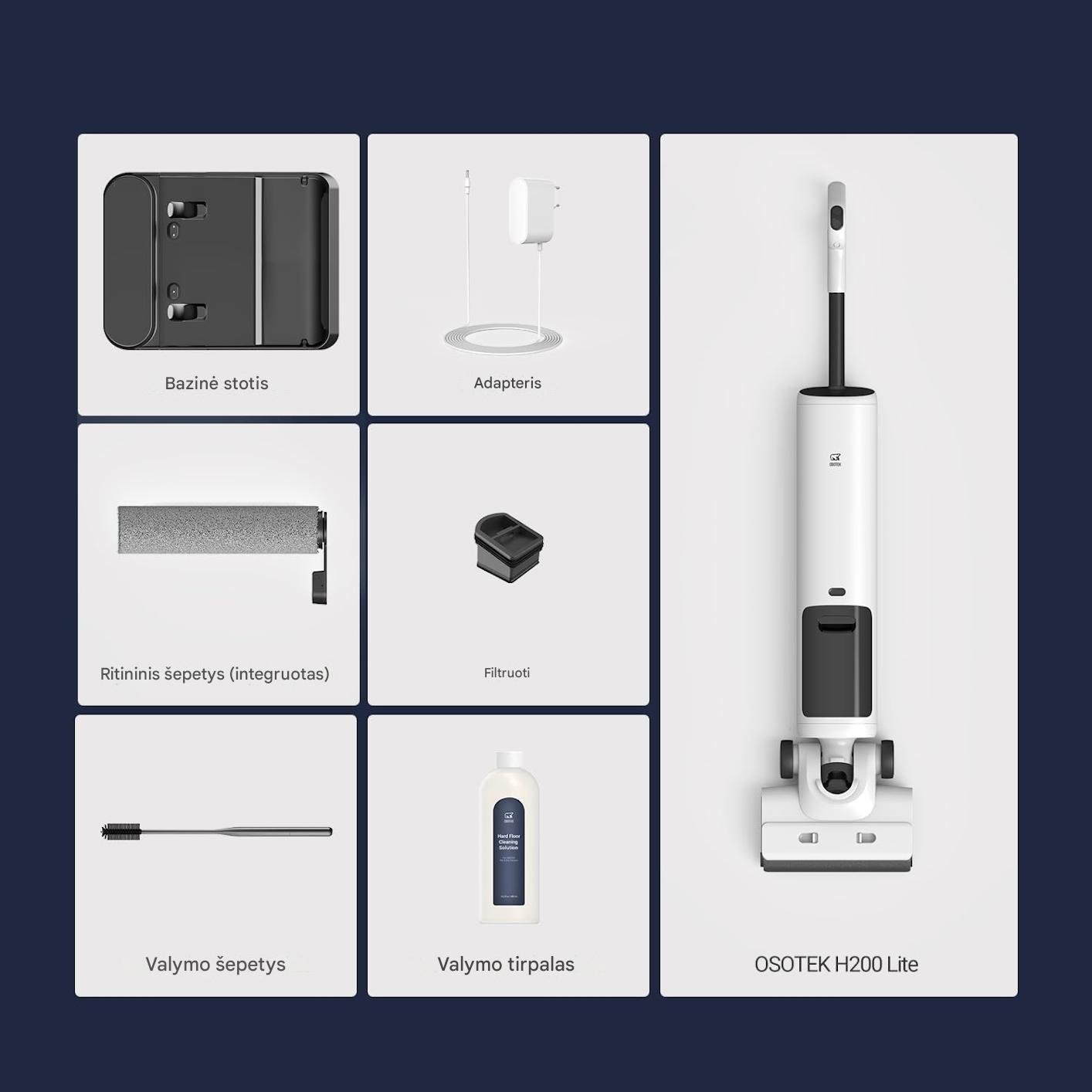 Pakuotėje: 1 x OSOTEK H200 Lite dulkių siurblys, 1 x šepetys, 1 x filtras, 1 x OSOTEK grindų valiklis, 1 x valymo įrankis, 1 x maitinimo šaltinis, 1 x įkrovimo stotelė, 1 x naudotojo vadovas (anglų kalba).