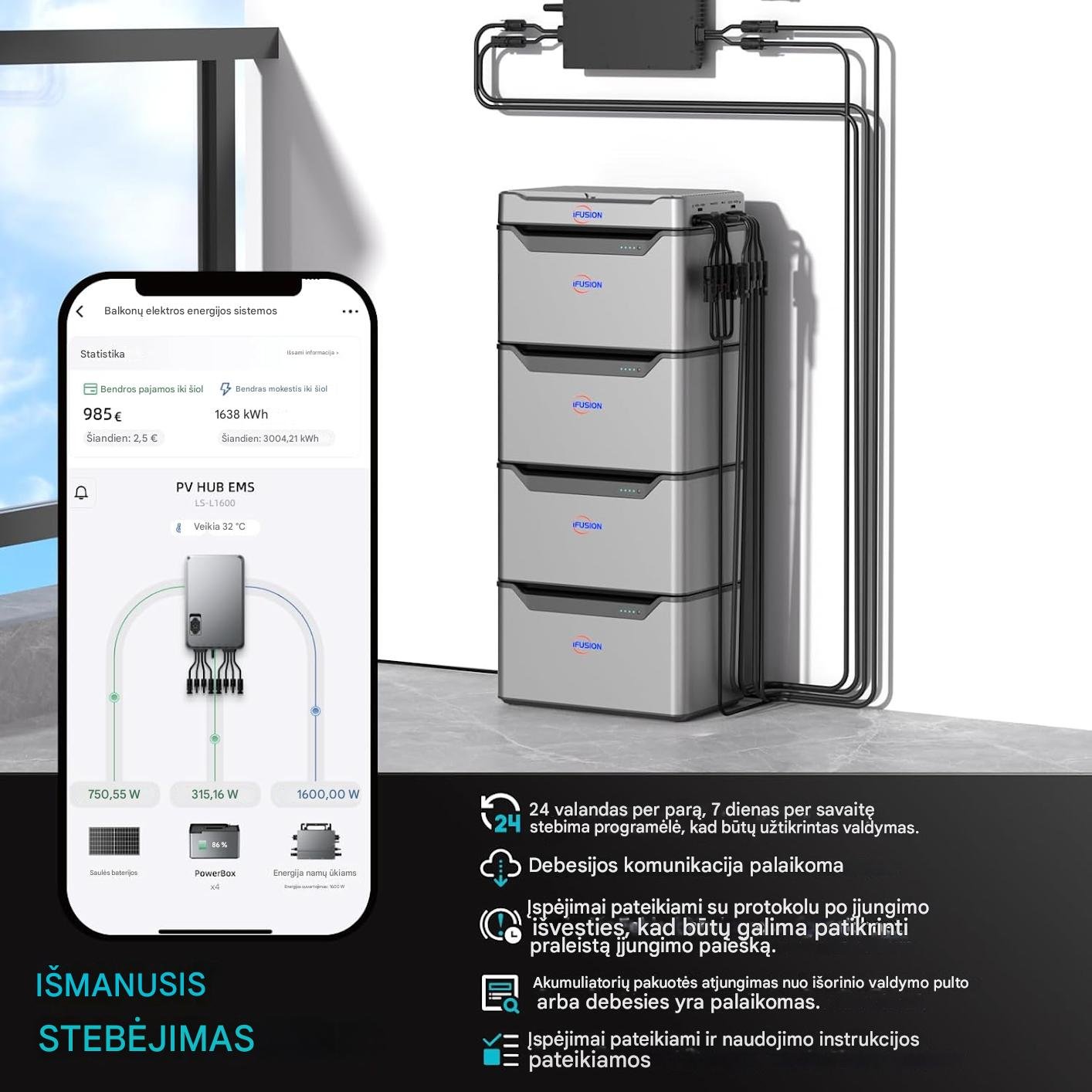 100 % suderinamumas: IFUSION yra 100 % suderinamas su visais mikro inverteriais ir balkonų elektrinėmis. Skirtingai nuo tradicinių sprendimų, jis lanksčiai sudedamas, kad padidintų talpą – tiesiog prijunkite prie bet kurio lizdo, kaupkite saulės energijos perteklių, optimizuokite energijos suvartojimą ir sumažinkite elektros energijos sąnaudas.
