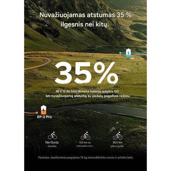 Variklis ir Baterija: Galingas 750 W bešepetėlinis galinės stebulės variklis, generuojantis 55 Nm sukimo momentą, leidžia pasiekti iki 45 km/h greitį (apribotas iki 25 km/h pagal ES reglamentus). Didelės talpos 48V 13Ah ličio jonų baterija (624 Wh) yra nuimama, o nuvažiuojamas atstumas siekia iki 100-120 km su pedalų pagalba (PAS režimu).