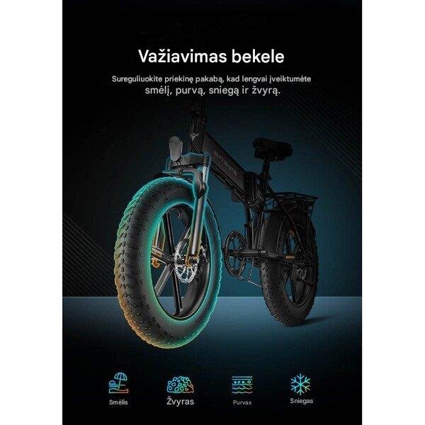 Ratai ir Padangos: 20 x 4.0 colių storos („fat“) padangos užtikrina maksimalų sukibimą ir stabilumą ant asfalto, sniego, smėlio ar nelygių takų.