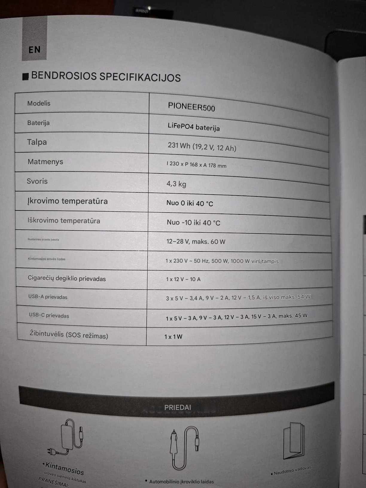 Kintamosios srovės lizdas: 1 x 230 V – 50Hz, 500W, 1000W viršįtampis