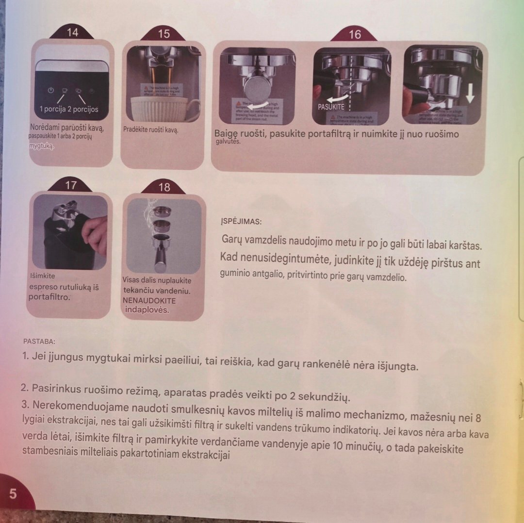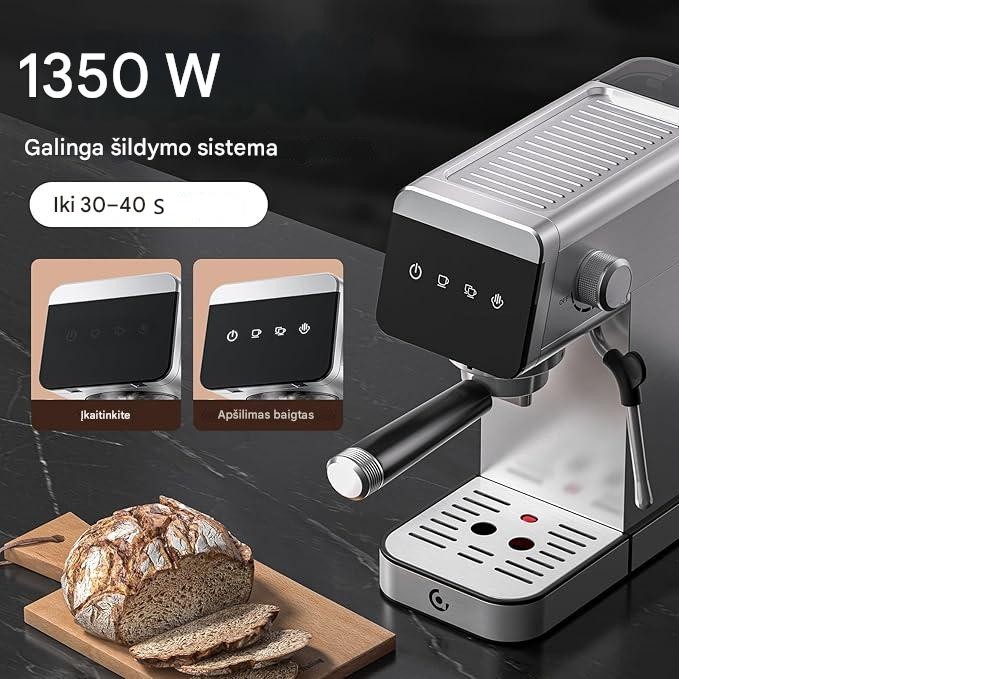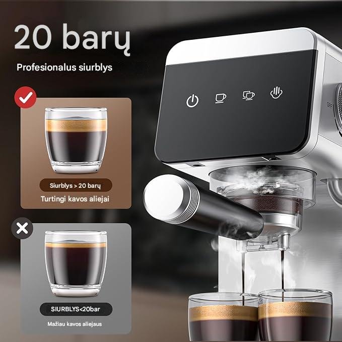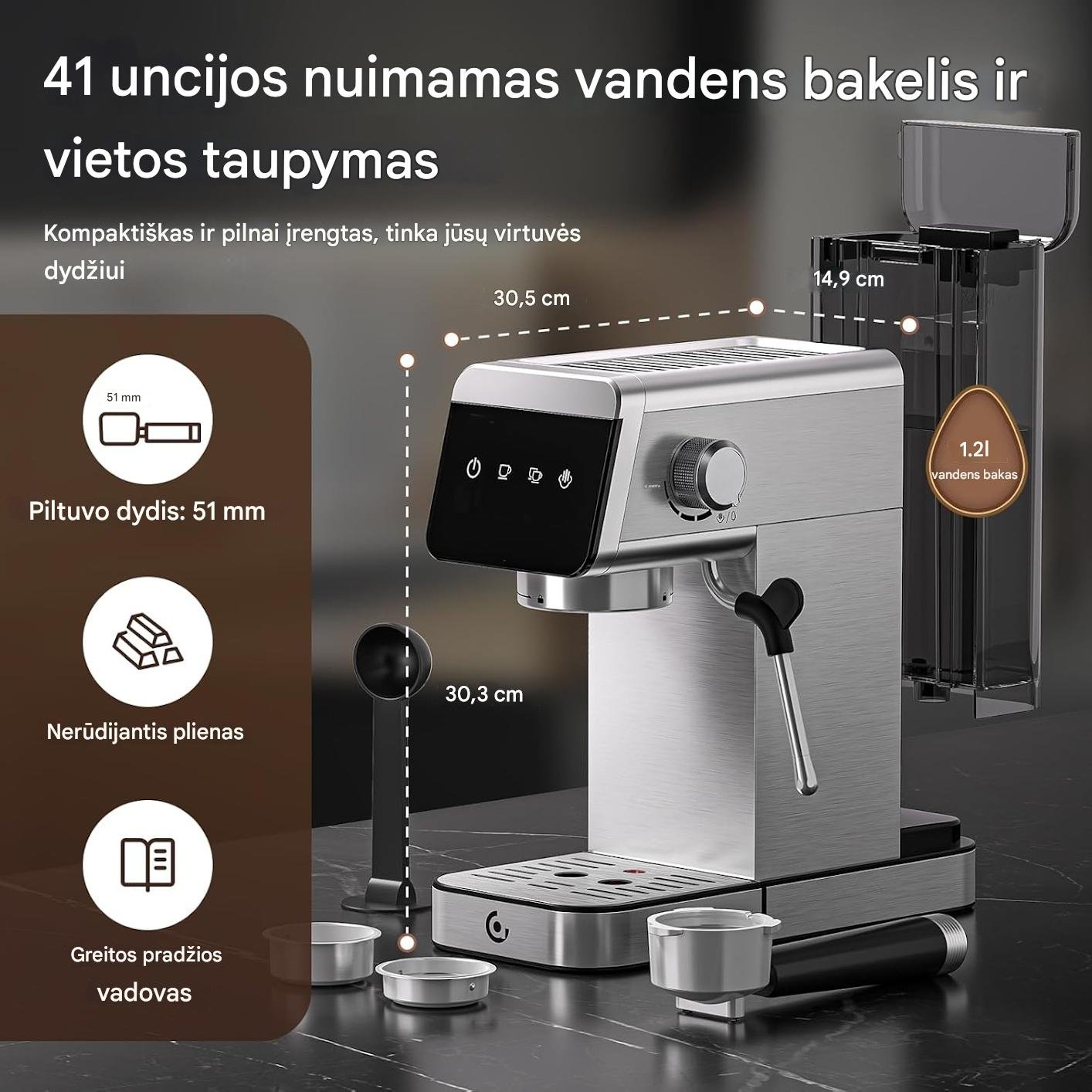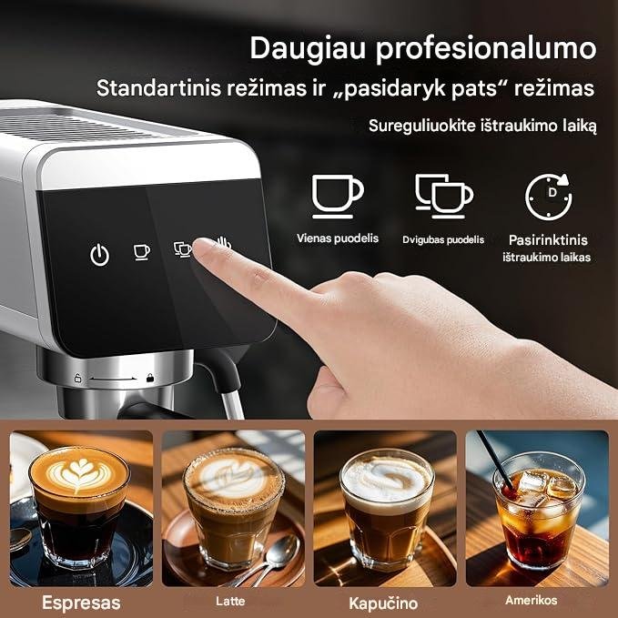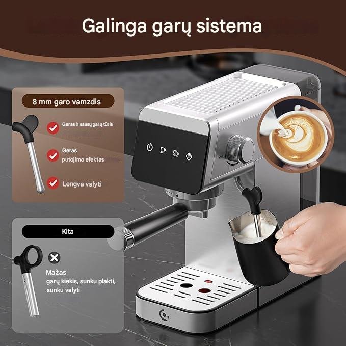 Espreso aparatas su pieno plakikliu: Šis pieno plakiklis turi galingą 8 mm garų vamzdelį, kuris sukuria kreminę ir aksominę mikroputų tekstūrą. Pagerinkite skonį ir sukurkite latte art taip pat lengvai, kaip barista. Su šiuo kompaktišku espreso aparatu galite lengvai paruošti espreso, kapučino ar latte kavą namuose, kad patenkintumėte įvairius savo kavos poreikius.