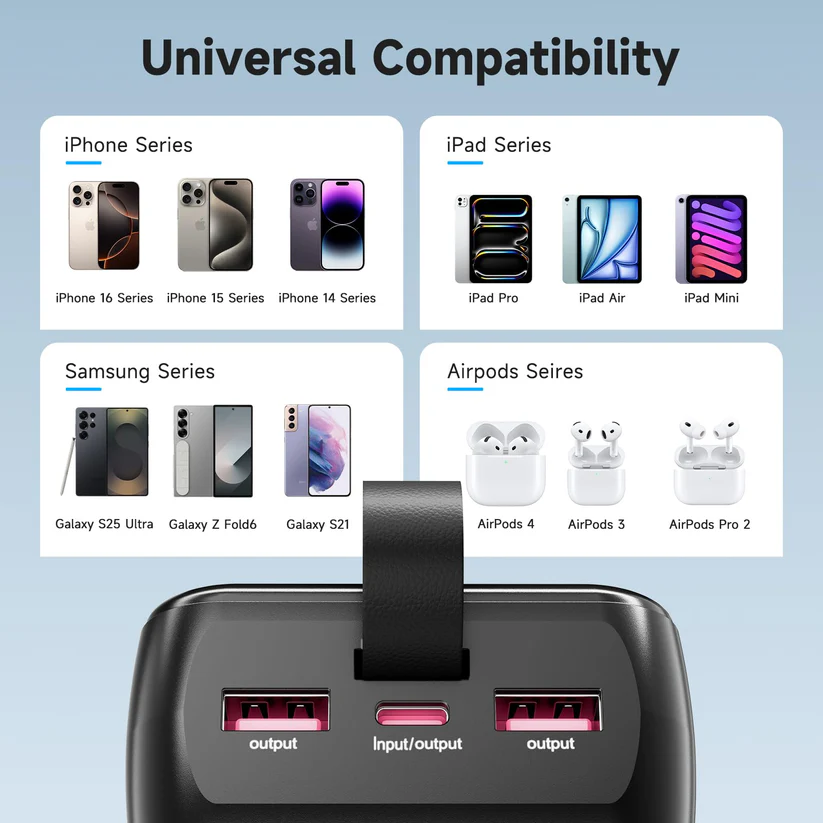 Itin didelė 42000 mAh talpa: ši 42000 mAh išorinė baterija suteiks jūsų įrenginiams daugiau nei pakankamai energijos. Suteiks pakankamai energijos visai savaitei. Idealiai tinka kelionėms, stovyklavimui, žygiams pėsčiomis, atostogoms ir kitai veiklai lauke.