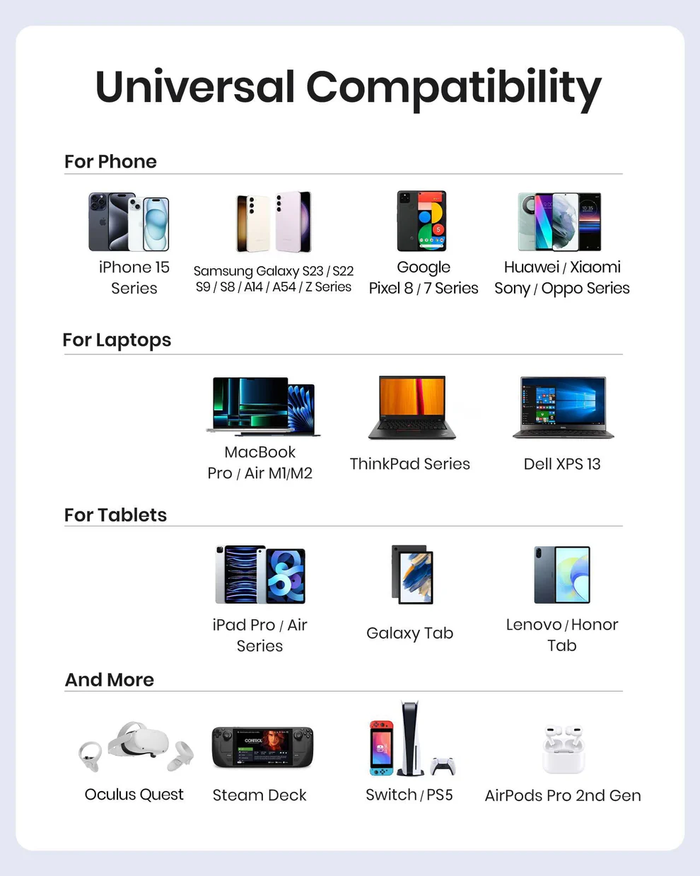 [Dar platesnis suderinamumas nei 60 W] Turėdamas galingą 100 W išvesties galią, mūsų USBC–USBC laidas įkrauna platesnį įrenginių asortimentą. Nuo USB-C telefonų iki „iPad“, flagmaninių nešiojamųjų kompiuterių, „Nintendo Switch“ ir kitų – jis lengvai įkrauna juos visus.