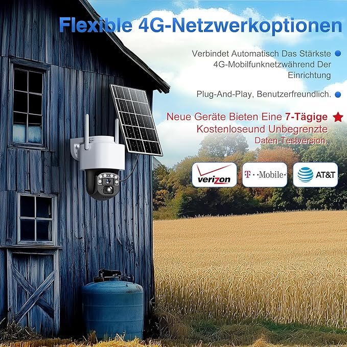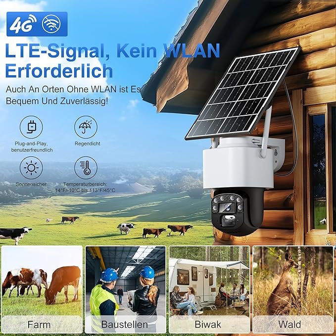 1.Nepriklausomas 4G ryšys – nereikia „Wi-Fi“: ši lauko kameros stebėjimo sistema veikia visiškai belaidžiu būdu – tiesiog įdėkite SIM kortelę ir bet kuriuo metu pasiekite savo išmaniuoju telefoną tiesiogiai per 4G LTE tinklą. Idealiai tinka sodui, tvartui, statybvietei ar kitoms vietoms be „Wi-Fi“.