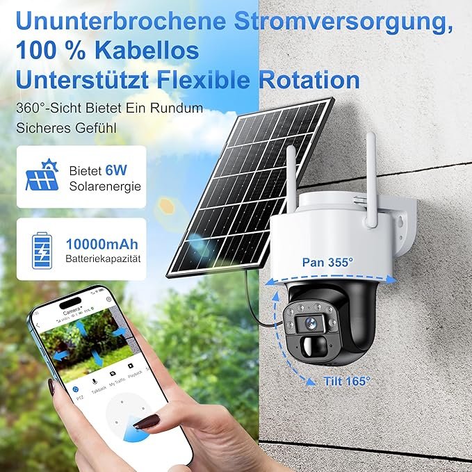 2. 100 % belaidis ryšys su saulės energija – galingas maitinimo šaltinis jūsų saugumui: ši lauko kamera turi įmontuotą 10 000 mAh bateriją, galingą saulės bateriją, įkrovimo prievadą ir 2 m maitinimo laidą. Tai garantuoja patikimą ir nepertraukiamą maitinimo šaltinį – idealiai tinka ilgalaikiam naudojimui lauke.