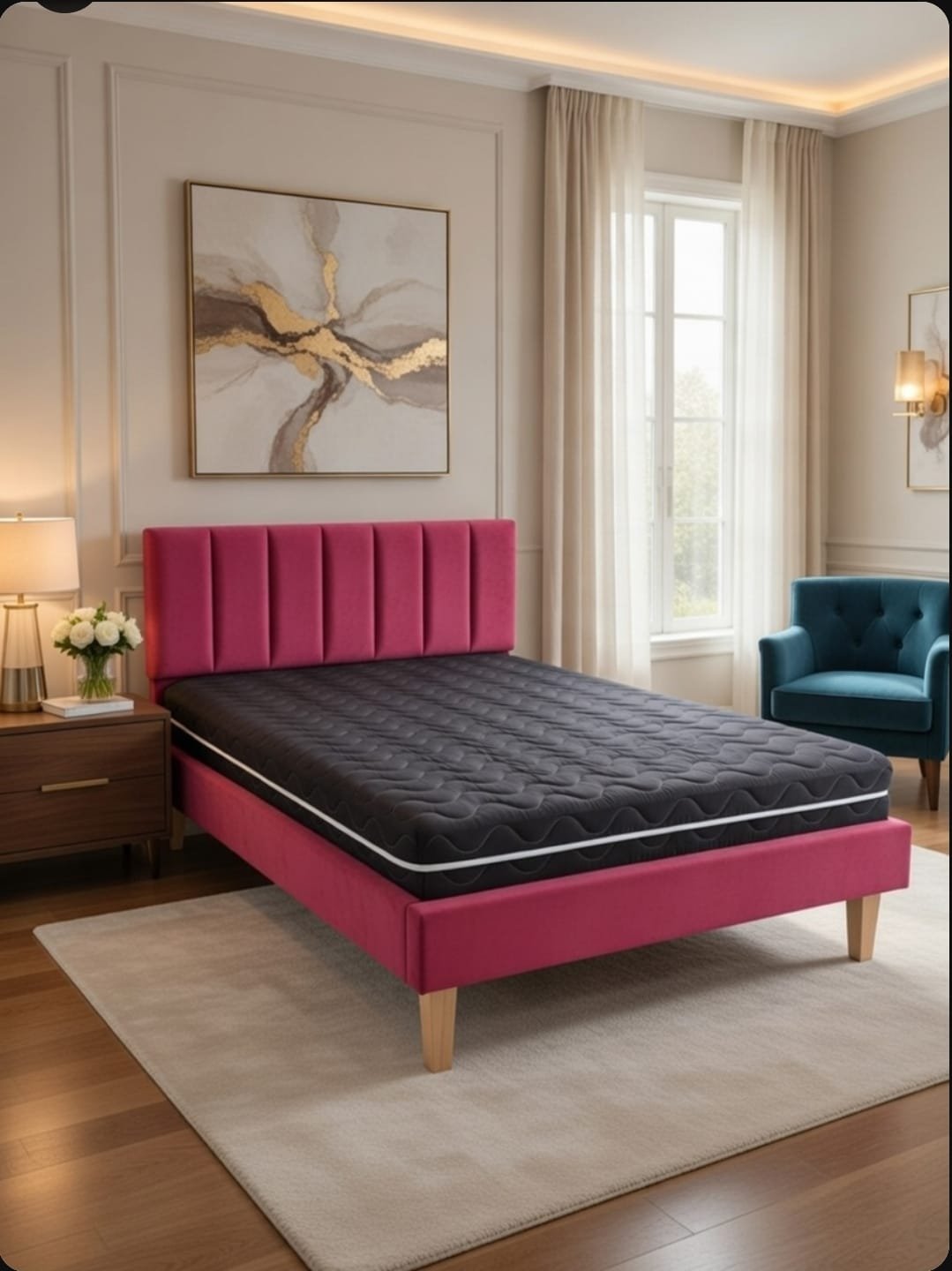 Elegantiškas stilius: Velvet apmuštas galvūgalis su atlošu, šis modernus ir struktūriškai tvirtas pagrindas suteikia jūsų lovai tvirtumo ir rafinuotumo.