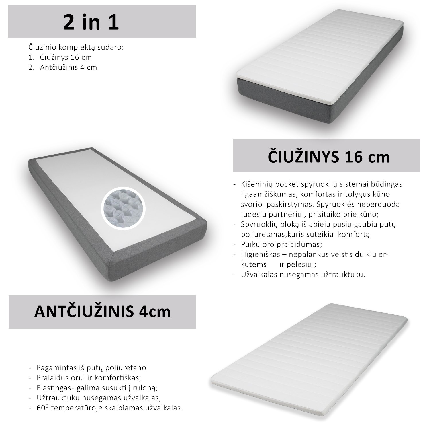 Siekiant suteikti maksimalų komfortą, komplekte yra papildomas 4 cm storio putų poliuretano antčiužinis. Jis prideda papildomo minkštumo ir patogumo, taip pat atlieka higieninę funkciją – jo užvalkalą galima skalbti net 60 °C temperatūroje.