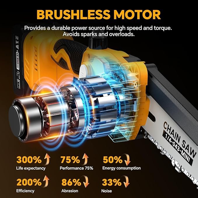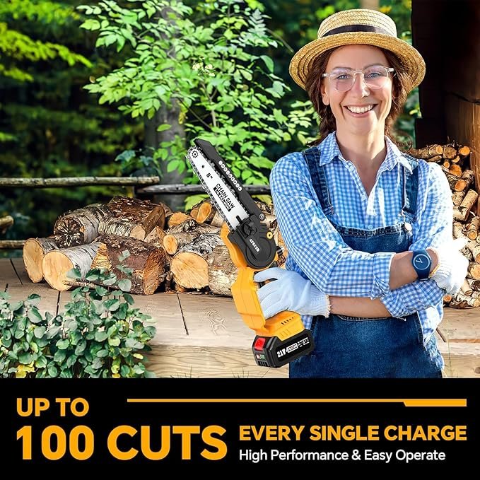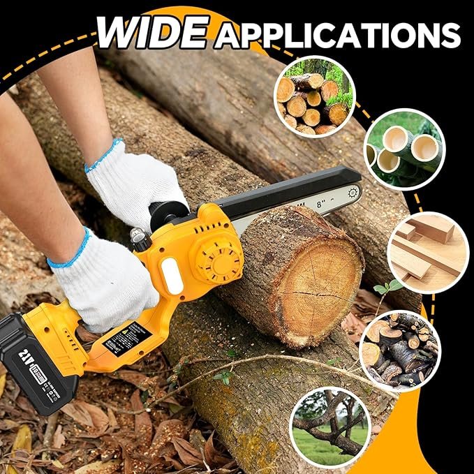 🚙【DAUGIAU SAUGUMO IR MAŽIAU TRIUKŠMO】 Šis mini grandininis pjūklas su akumuliatoriumi turi apsauginį užraktą ir apsaugą nuo taškymosi. Kad pjūklas netyčia neužsivestų, apsauginį užraktą ir gaiduką reikia paspausti vienu metu. Apsauga nuo taškymosi neleidžia pjuvenoms taškytis darbo metu. Triukšmas yra labai mažas, todėl nereikės nerimauti, kad trikdysite kaimynus.