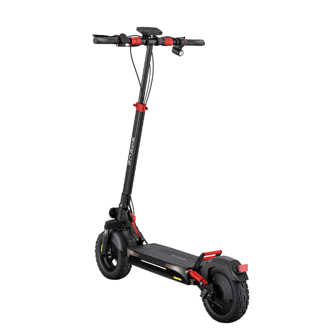 Storos pripučiamos 10′ padangos ir amortizatorių sistema užtikrina, kad šis paspirtukas važiuos bet kokiomis sąlygomis.