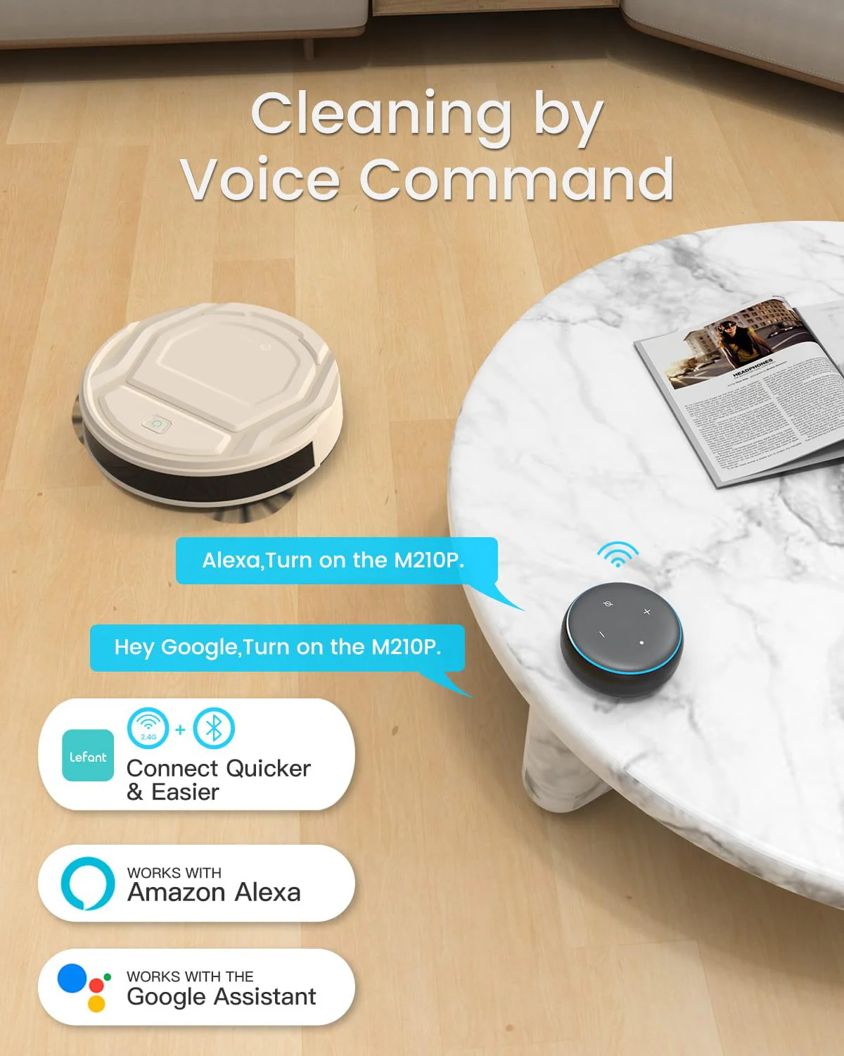 【Išmanioji programėlė ir balso valdymas】: Nuostabiausia funkcija yra grafikas. Naudodami „Lefant“ programėlę nustatote tam tikrą grafiką ir valymo tipą, o robotas dulkių siurblys atliks visa kita. Tokiu būdu, kai grįšite, jis jau bus švarus. Be to, „Lefant“ programėlė gali reguliuoti siurbimo ir… kryptį, patikrinkite valymo plotą ir kt. Automatinis dulkių siurblys robotas taip pat duoda komandas balsu per „Alexa“ arba „Google Assistant“.