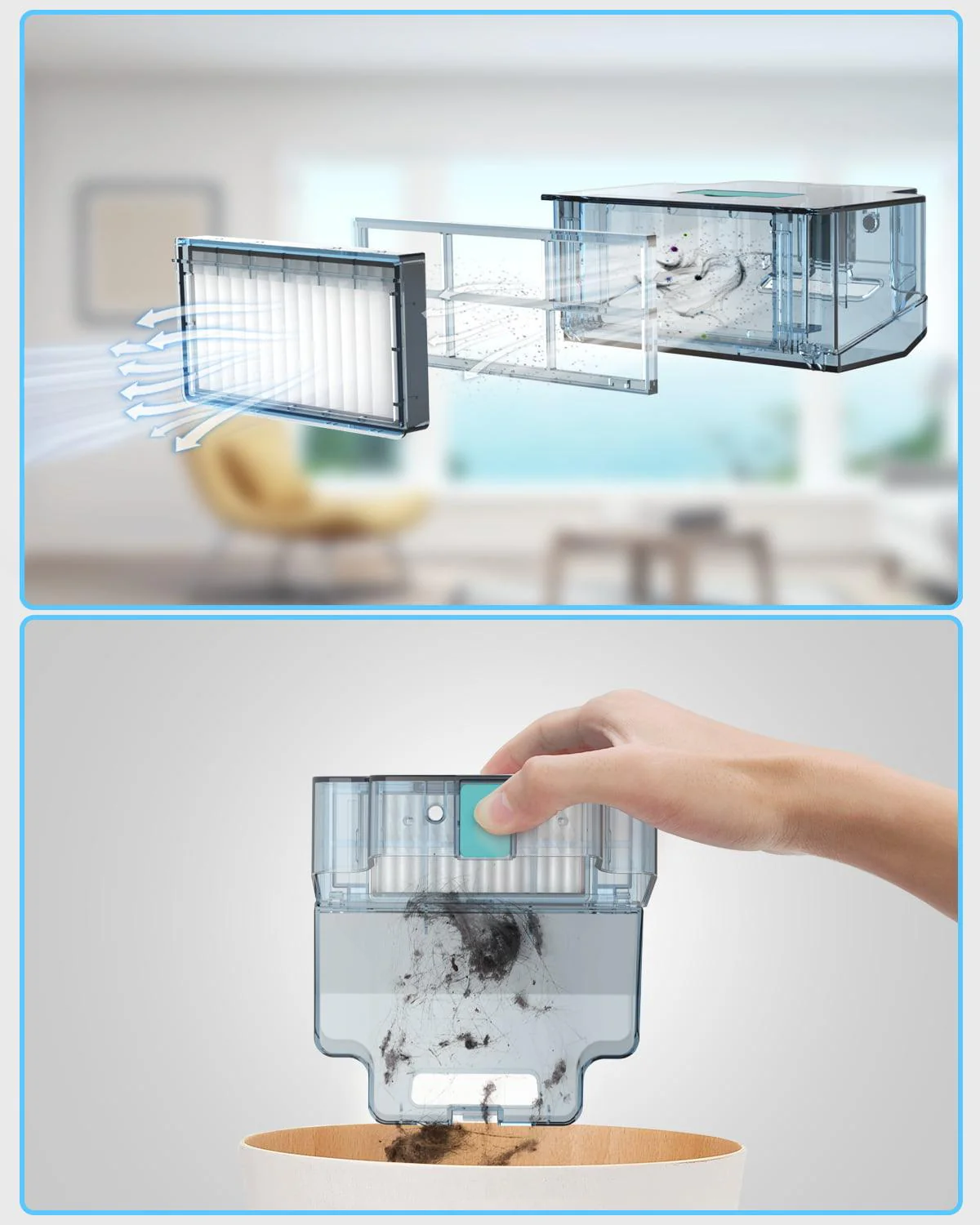 【Unikali bešepetėlinė siurbimo anga】: Robotas dulkių siurblys, varomas galingu skaitmeniniu varikliu, užtikrina didelę siurbimo galią. Unikali bešepetėlinė siurbimo konstrukcija užtikrina, kad naminių gyvūnėlių plaukai ir nešvarumai lengvai patektų į dulkių konteinerį, nes, skirtingai nei ritininiai šepečiai, siurbimas neįsipainioja plaukų.