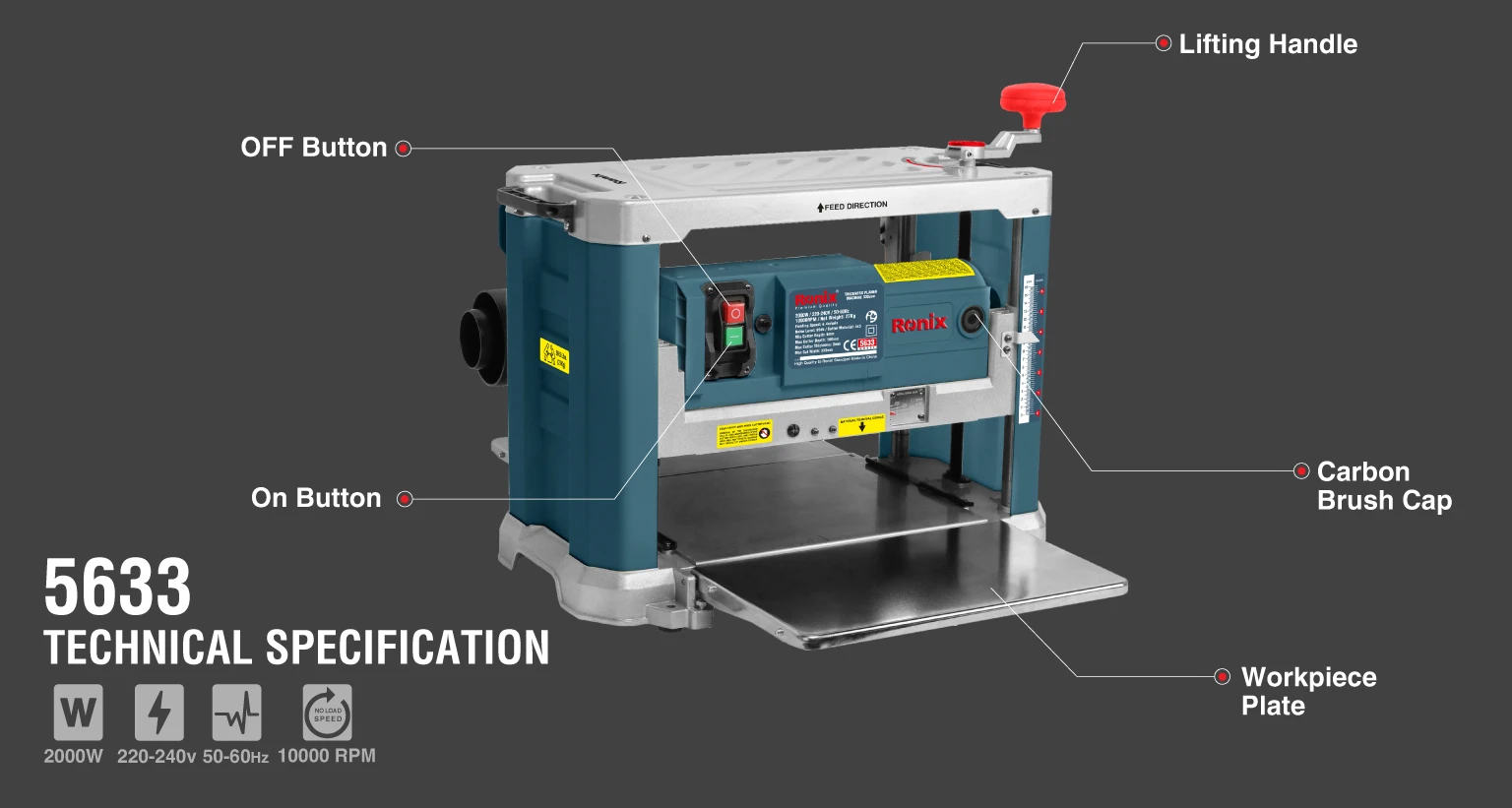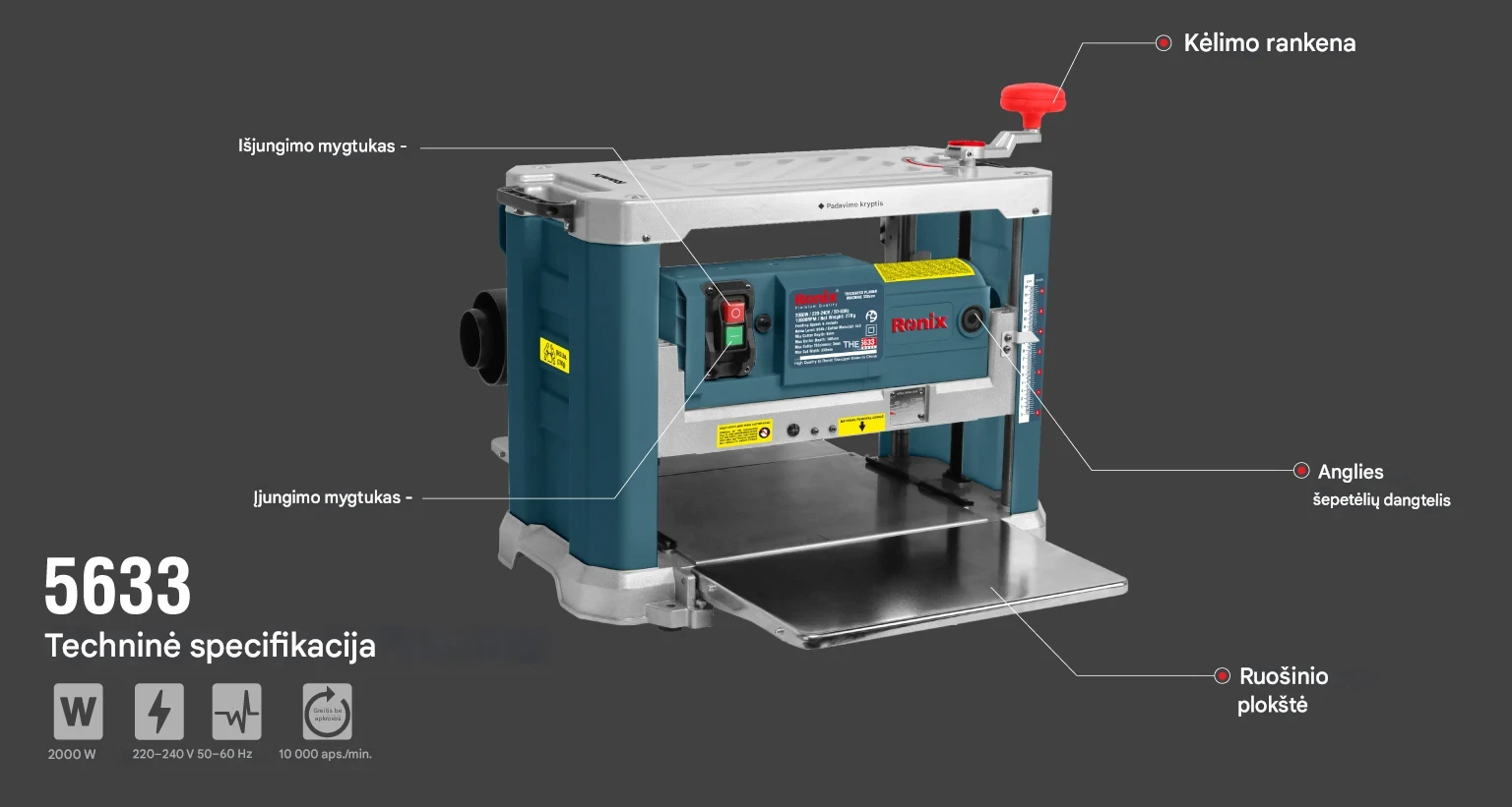Pradžia Darbo įrankiai RONIX Storio obliavimo staklės 330 mm (5633)