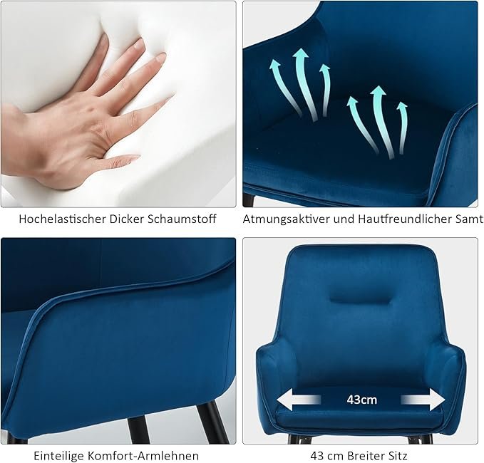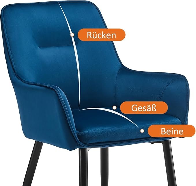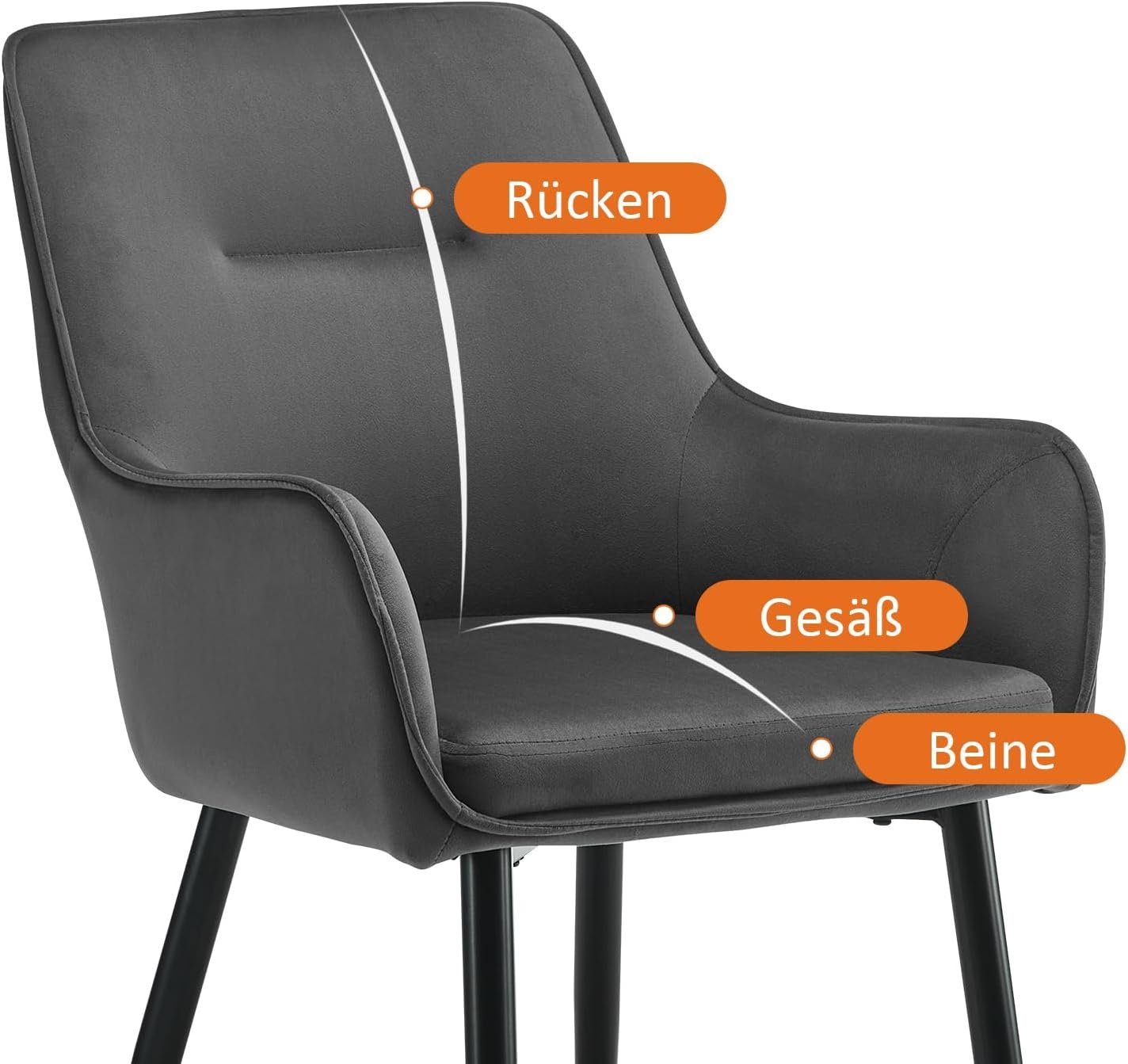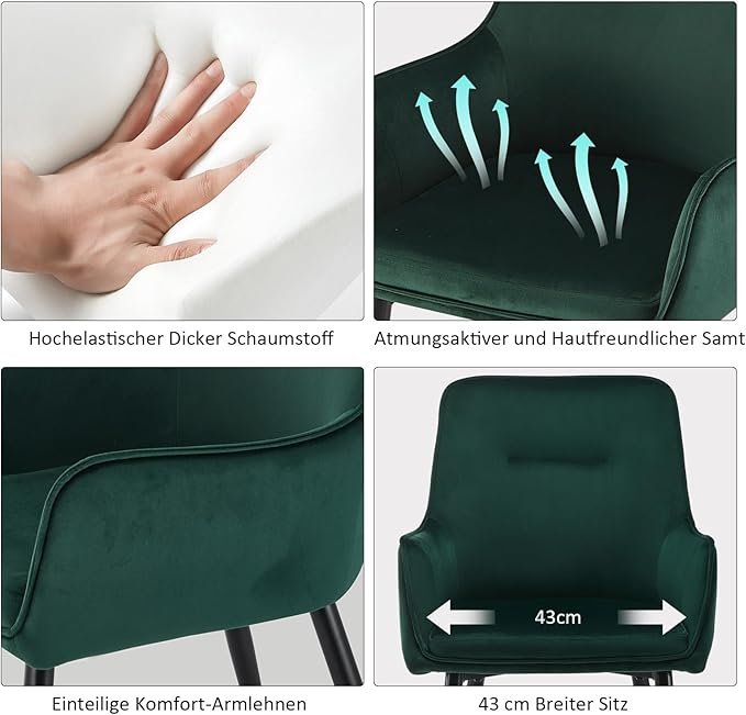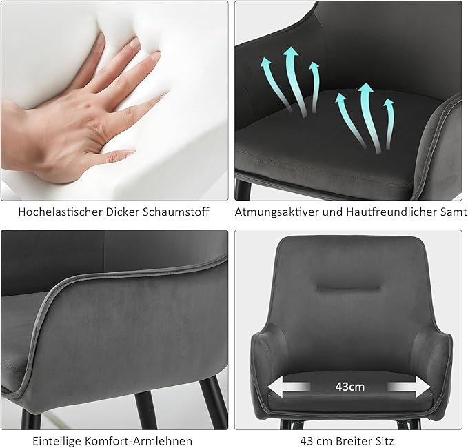Kvėpuojančios ir odai draugiškos aukščiausios kokybės aksominės medžiagos apmuštos valgomojo kėdės: laisvalaikio valgomojo kėdės pagamintos iš aukštos kokybės aksomo, yra patogios ir draugiškos odai, atsparios dilimui, labai laidžios orui ir minkštos sėdėti. Išskirtiniai siuvimo siūlai, lengva prabanga ir madingas dizainas sukuria vizualinį estetinį vaizdą namuose.